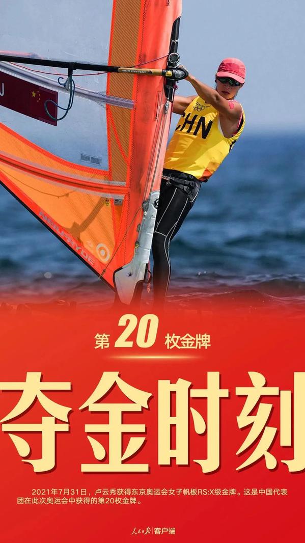 7月31日,东京奥运会女子帆板比赛,中国选手卢云秀夺得女子帆板RS:X级冠军,为中国队赢得第20枚金牌!