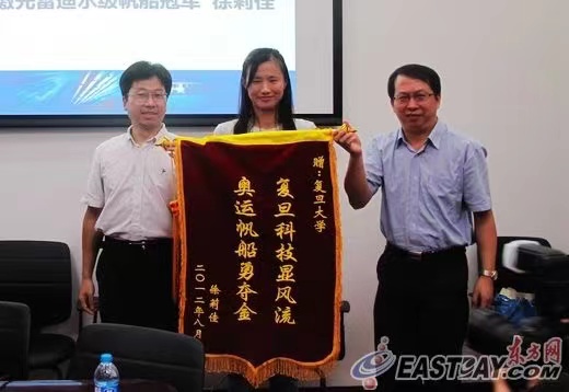 2012年奥运冠军徐莉佳来复旦大学送上锦旗