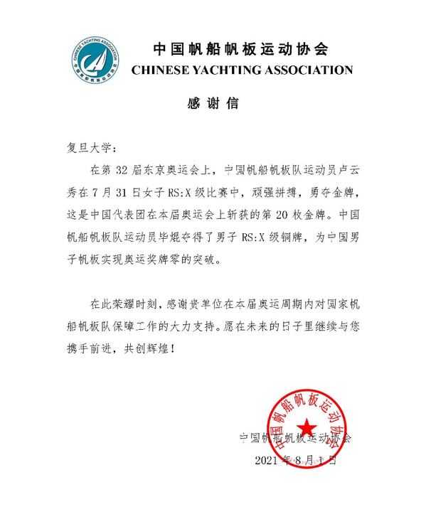 8月1日,复旦大学收到了来自中国帆船帆板运动协会的感谢信