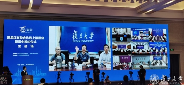 8月6日上午,黑龙江省校合作推进会暨集中签约仪式在线上举行。复旦大学在邯郸校区综合楼设分会场,会上,黑龙江省和复旦大学在线签署了省校战略合作框架协议。