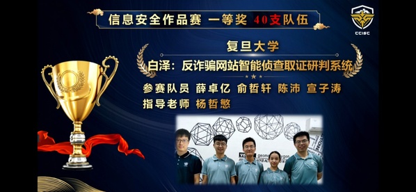 8月30日,第十四届全国信息安全竞赛作品赛落幕。经过两天的角逐,来自复旦大学计算机科学技术学院系统软件与安全实验室的本科生团队凭借作品《白泽:反诈骗网站智能侦查取证研判系统》斩获全国一等奖,团队指导教师杨哲慜获得了优秀指导教师奖。