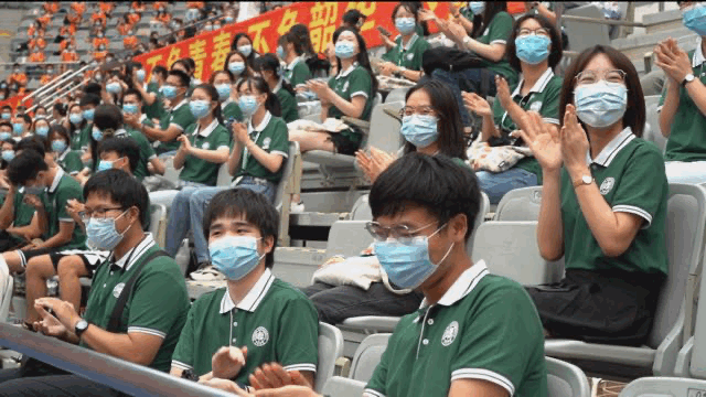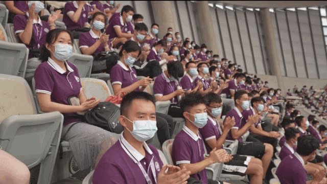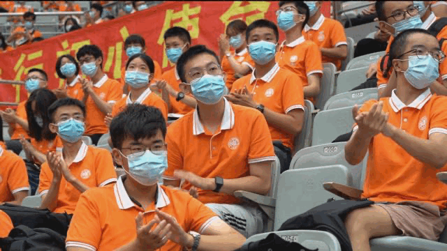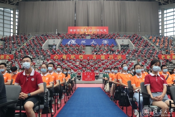 绿、红、蓝、橙、紫——志德、腾飞、克卿、任重、希德五大书院的新生坐满正大体育场。他们高喊着复旦校训、复旦精神、各书院口号。课铃声响起,在一片掌声中焦扬走上讲台,当她问大家我们的共同身份是什么,新生们一起喊出“复旦人”时,她告诉大家“对!这是我们的共同身份。”