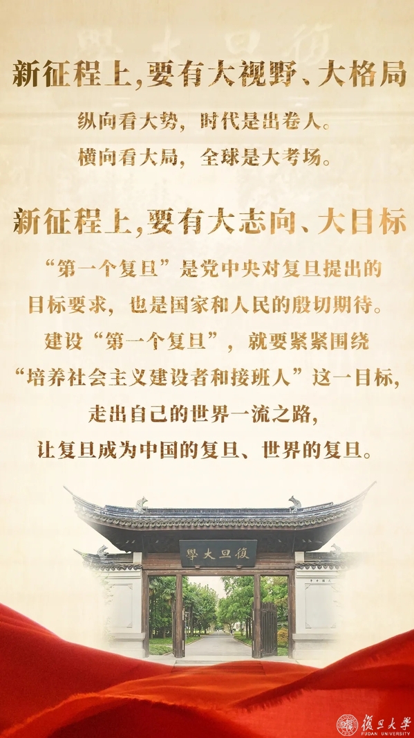 复旦人的大志向和大目标是什么?2014年习近平总书记在北大师生座谈会上讲到:“世界上不会有第二个哈佛、牛津、斯坦福、麻省理工、剑桥,但会有第一个北大、清华、浙大、复旦、南大等中国著名学府。” “第一个复旦”,是党中央对复旦提出的目标要求,是国家和人民的殷切期盼,是复旦人的使命。