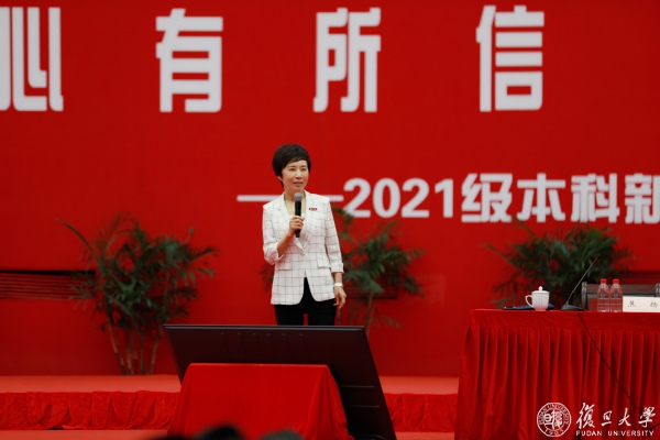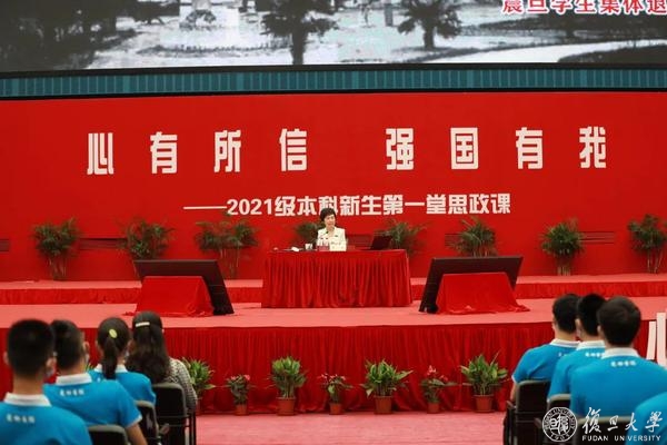 9月11日上午,来自祖国和世界各地的4022名复旦本科新生聆听开学第一课。这堂课的主讲人是复旦大学党委书记焦扬,这也是她坚持为新生上思政课的第五个年头,她带来的题目是《心有所信 强国有我》。按照防疫要求,其中2400名新生在正大体育馆现场听课,还有的新生则在光华楼吴文政报告厅、蔡冠深报告厅、谢希德报告厅等分会场看直播。