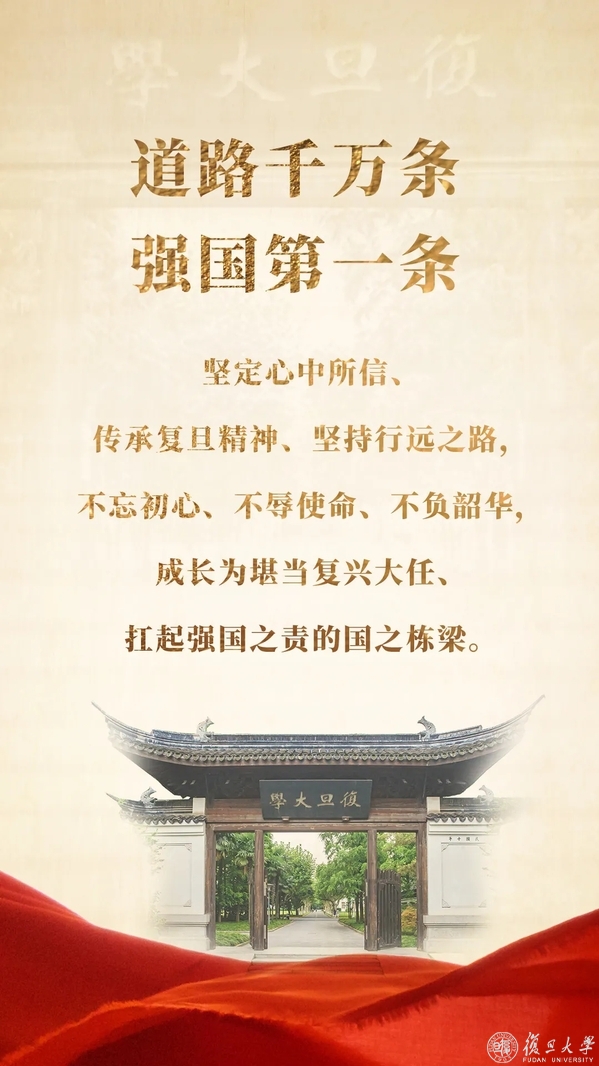 “道路千万条,强国第一条。希望大家坚定心中所信、传承复旦精神、坚持行远之路,不忘初心、不辱使命、不负韶华,成长成为堪当复兴大任、扛起强国之责的国之栋梁!”