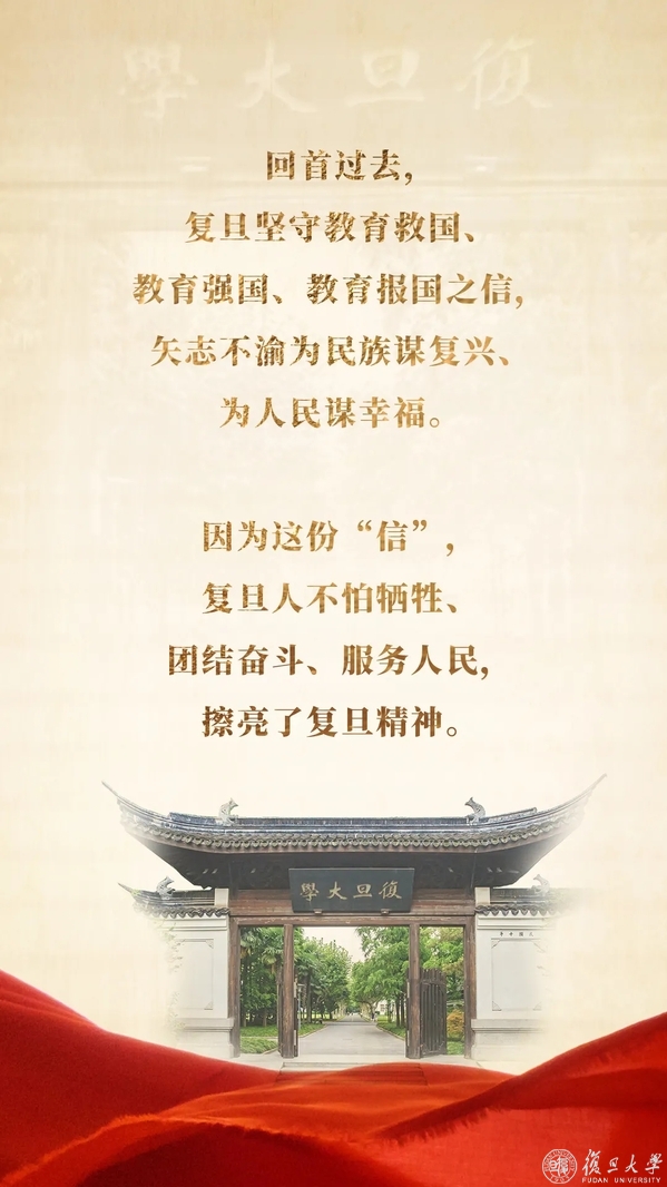 马相伯毁家兴学教育救国,颜福庆打破垄断自主办学。伴着光荣的传统,复旦敲响上海“五四第一钟”,复旦成为最早建立党团组织的高校之一。“茅屋里求学,战火中教书”、“狱中不忘宣传真理,鼓舞群众斗志”,抗战的炮火没有击穿复旦的红色堡垒,更没有击垮红岩烈士。李登辉立下延续至今“团结、服务、牺牲”的复旦精神。望道校长翻译《共产党宣言》的故事,激励每一位复旦人做宣言精神的忠实传人。
