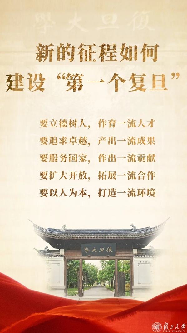站在新起点上,“第一个复旦”又该如何建设?要立德树人,作育一流人才;要追求卓越,产出一流成果;要服务国家,作出一流贡献;要扩大开放,拓展一流合作;要以人为本,打造一流环境。