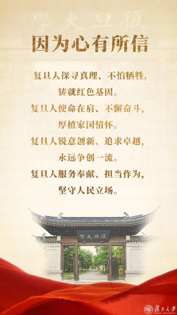 取自《尚书大传·虞夏传》的复旦二字,“日月光华,旦复旦兮”,寓意了追求光明、自强不息、复兴中华 ,蕴含了国人自主办学,教育救国的理想。焦扬对同学们说,这就是复旦的创校之“信”。因为心有所信,复旦人探寻真理、不怕牺牲,铸就红色基因;复旦人使命在肩、不懈奋斗,厚植家国情怀;复旦人锐意创新、追求卓越,永远争创一流;复旦人服务奉献、担当作为,坚守人民立场。“这信仰信念如同旭日光耀,指引复旦人始终奋斗在救国、兴国、富国、强国的伟大征程中,成为复旦百十载不变的初心。”