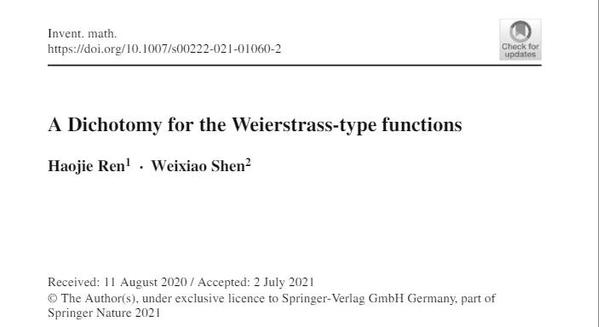 2021年7月,沈维孝教授与数学科学学院博士生任浩杰在“数学四大期刊”《数学新进展》(Inventiones mathematicae)上发表最新论文《魏尔斯特拉斯型函数的二分法》(“A Dichotomy for the Weierstrass-type functions”),成功解决了魏尔斯特拉斯型函数的维数问题。