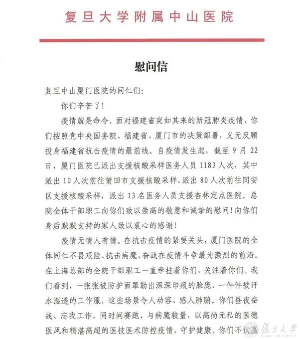 复旦中山厦门医院作为中山医院的医联体单位之一,是复旦大学和厦门市合作建设的重大民生项目,首批国家区域医疗中心单位。疫情发生后,上海总部的全院干部职工一直牵挂着、关注着远在千里之外的复旦中山厦门医院同仁,并向他们致以崇高的敬意和诚挚的慰问。