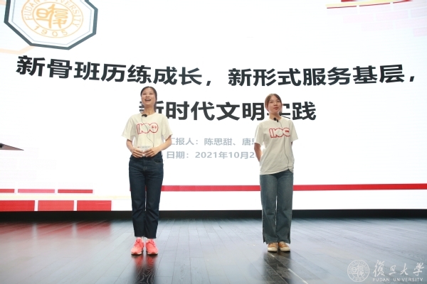 “本科生新生骨干培训班暑期虹口基层”项目团队代表、新闻学院2020级本科生陈思甜和基础医学院2020级本科生唐思憧以“新骨班历练成长、新形式服务基层、新时代文明实践”为题,分享了在虹口区新时代文明实践中心进行志愿服务工作的经历。她们表示,这份实践经历增进了对基层治理的理解和体会,体会了群众路线,感受了家国情怀,坚定了入党初心。