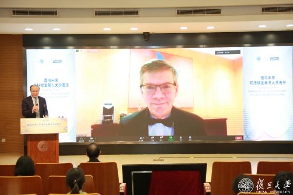 金力的《面向未来——复旦大学促进可持续发展目标实现的创新与实践》主旨报告,从人才培养、科学研究、服务社会和全球合作等四个方面,介绍了复旦大学在可持续发展目标各个领域的创新与实践。