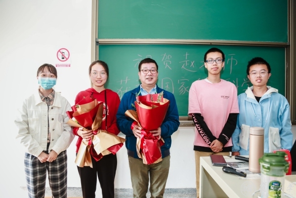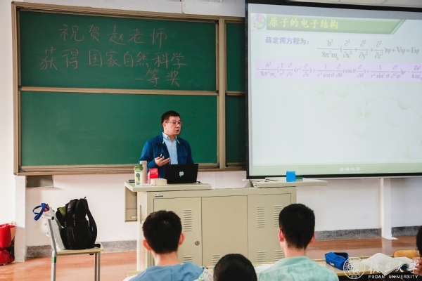 黑板上红色粉笔写着:“祝贺赵老师获得国家自然科学奖一等奖”。从教室两侧走来几位捧着鲜花的学生,“祝贺赵老师获奖,祝愿赵老师在今后的科研道路上获得更多丰硕的成果”。赵东元颇感意外,接过鲜花后连声对同学表示感谢,“谢谢大家,赵老师还是教书为主,和你们继续一起学习《普通化学》。我们开始上课吧。”