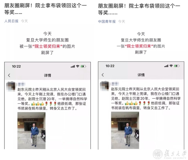 周桂发没想到,赵东元昨天领奖,今天上课,一等奖证书装在帆布袋,还没有来得及带到办公室。“我平时都不拍照,不发朋友圈。今天看了,有感而发,给赵院士拍了照,随手发了个朋友圈,没想到上热搜,还被人民日报、中国青年报转发,成为爆款。”