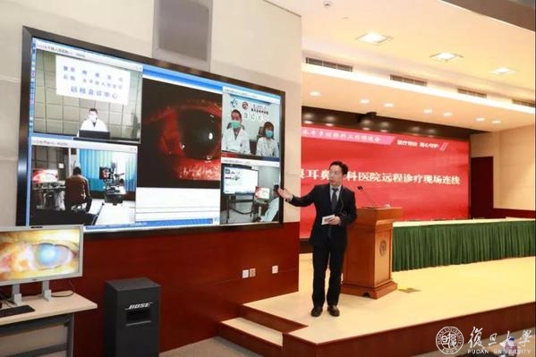 永平县的医生正在为患者诊断眼科疾病,患者的裸眼3D影像实时传输至复旦大学附属医院的专家面前,双方医生就病情进行远程沟通交流——这个场景是复旦通过“互联网+医疗”帮扶永平的一个缩影。