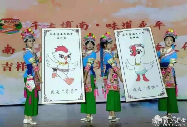 在复旦党委学生工作部的支持下,新闻学院2019级本科生汪洋首次设计出永平博南文化节的卡通吉祥物“勇勇”和“萍萍”,为永平注入时尚新风。“勇勇”以“博南山鸡”为形象,以“千古博南”为主题,融入古道历史、丝路精神等元素,体现出永平人民“勇敢、进取、探索”的精神风貌;“萍萍”以“永平白鹅”为形象,以“永平味道”为主题,融入古道风光、独特味道等元素,体现永平人民“热情、淳朴、善良”的文化内涵。
