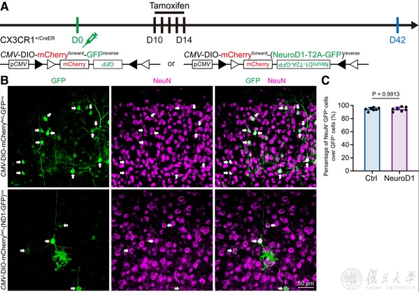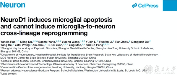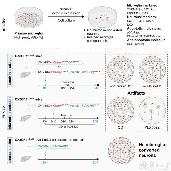 复旦大学脑科学转化研究院彭勃课题组、复旦大学附属华山医院毛颖课题组和上海市精神卫生中心袁逖飞课题组的研究人员开展的联合攻关,利用活细胞成像、严谨谱系追踪和药理学等多个手段对NeuroD1介导的小胶质细胞-神经元重编程现象进行了系统性探索。2021年12月6日,相关研究成果以NeuroD1 induces microglial apoptosis and cannot induce microglia-to-neuron cross-lineage reprogramming为题,发表在神经科学顶级期刊《神经元》(Neuron)上(图1)。