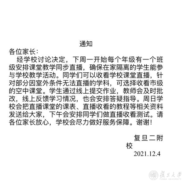 12月4日下午一点半,第一条正式通知进入家长们的视野,“下周一开始每个年级有一个班级安排课堂教学同步直播”“学生通过线上提交作业”“周日学校安排课表”等关键信息抚慰了家长们焦灼的心情。