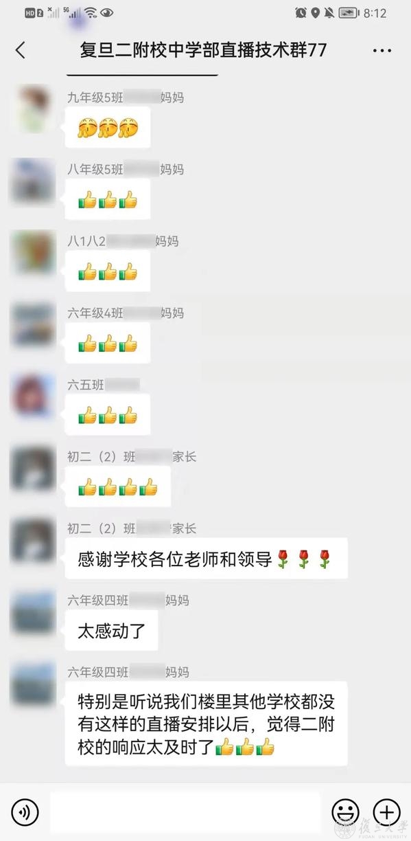 12月5日,校方老师组建了“复旦二附校中学部直播技术群”,“复旦二附校小学部直播技术群”,撰写了直播平台操作指南,并邀请所有进行线上教学的同学家长入群,协助孩子们进行下午三时的直播调试,熟悉平台、发现、解决问题,为第二天一早的在线课堂预演。这项贴心及时的举措收到了技术群里家长们的一致点赞:“太感动了,特别是对比之下,觉得二附校的响应太及时了。”