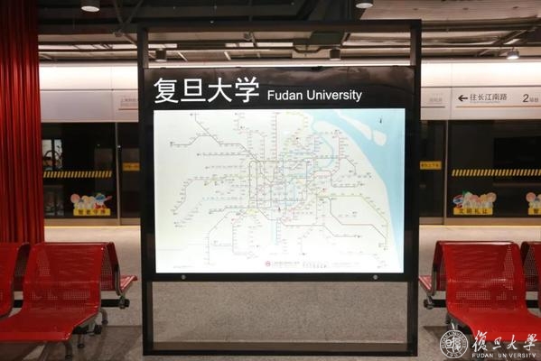 站名墙以我校1920年奠基江湾时的校园规划图为蓝本,呈现复旦人精神家园的风貌。