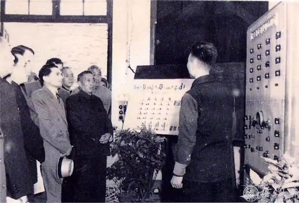 陈望道校长陪同来宾参观复旦601型电子积分机(模拟计算机)