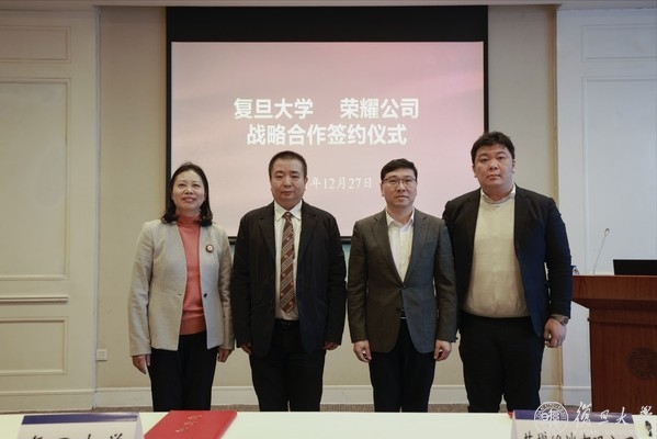 12月27日,复旦大学与荣耀在复旦大学邯郸校区举行战略合作签约仪式。复旦大学校长、中国科学院院士金力,荣耀董事长万飚出席签约仪式并讲话。复旦大学常务副校长许征、荣耀研发管理部总裁邓斌出席活动并代表双方签署战略合作协议。