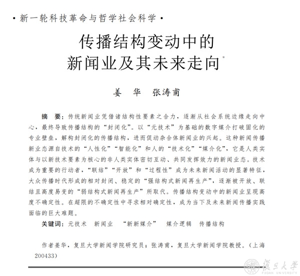 《传播结构变动中的新闻业及其未来走向》(姜华、张涛甫)刊发于《中国社会科学》2021年第8期“新一轮科技革命与社会科学”栏目。两位作者从着手准备到论文发表,前后历经两年多、四十余次修改。该文系四十年来新闻传播领域在这家重要学术期刊发表的为数不多的几篇论文之一。