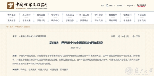 《世界历史与中国道路的百年探索》刊发于《中国社会科学》2021年第6期。