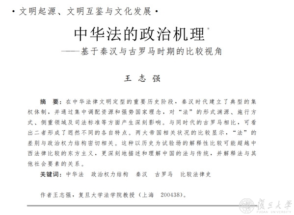 《中华法的政治机理——基于秦汉与古罗马时期的比较视角》刊发于《中国社会科学》2021年第10期,是近年来比较法律史的重要成果。