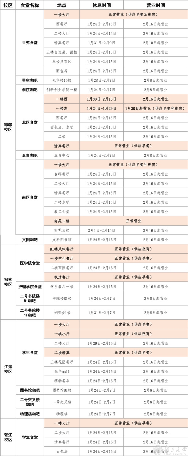 寒假期间各区域食堂经营时间安排如下: