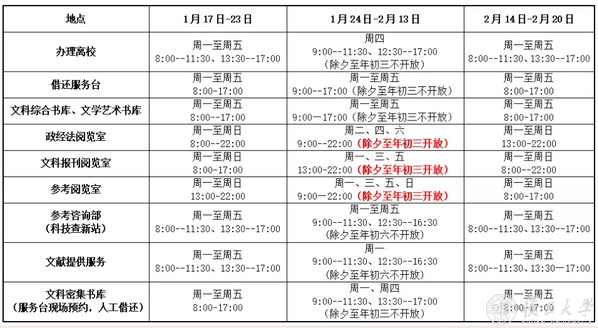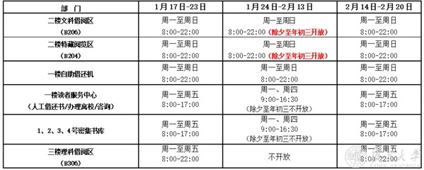 寒假期间,各馆具体开放时间请见附表所示。若在相关阅览室关闭期间需要使用其中书刊资料,请提前和值班老师联系,联系方式详见图书馆主页。