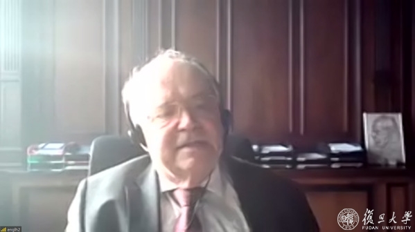 恩格尔回忆了与复旦长达近四十年的渊源和长期卓有成效的合作,并展示了珍藏多年的复旦大学荣誉教授聘书。他表示,维也纳大学重视与复旦大学的伙伴关系,两校在各学科领域的科研合作和人才培养取得了丰硕的成果,诚挚期待双方尽快重启面对面的深入交流与合作。恩格尔还介绍了维也纳大学参与的欧洲大学联盟,并提出可以联合联盟中的其他欧洲高校一起加强与复旦的深入合作。