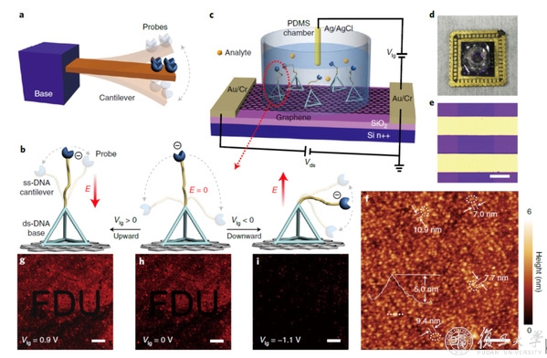 图1. (a)微/纳米机电系统示意图;(b)分子机电系统示意图;(c-e)基于分子机电系统的晶体管传感器及芯片图片;(g-f)传感芯片的共聚焦荧光显微镜和原子力显微镜表征图片。