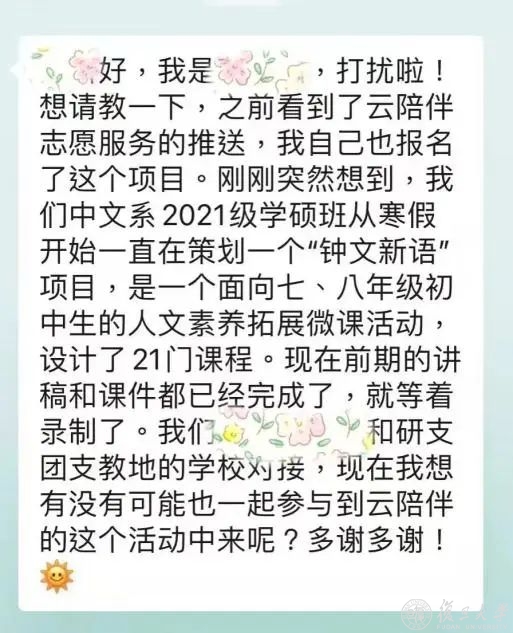 了解到“云托班”志愿服务还会配套公开直播和录播课,有些“一对一”陪伴志愿者还积极主动地挖掘身边的资源,为“云托班”公开直播/录播课程提供了很大的便利。