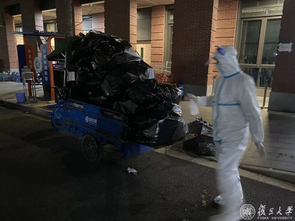 校园里,还有一支“公寓保障队”为大家奔波忙碌着。“学生公寓楼的垃圾清运结束,共清运垃圾122车。”总务处宋晟老师拍了照片,在后勤保障专班群汇报。在校园封闭管理期间,这些“大白”负责为书院楼清理生活垃圾,他们每天几乎都要忙碌到晚上近10点收工。