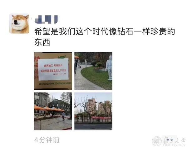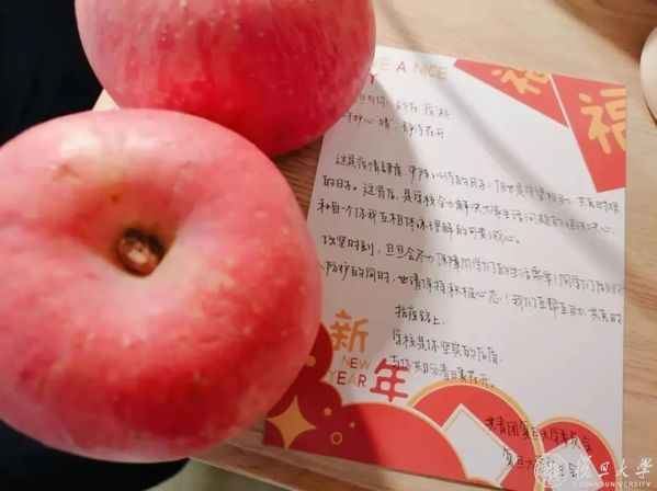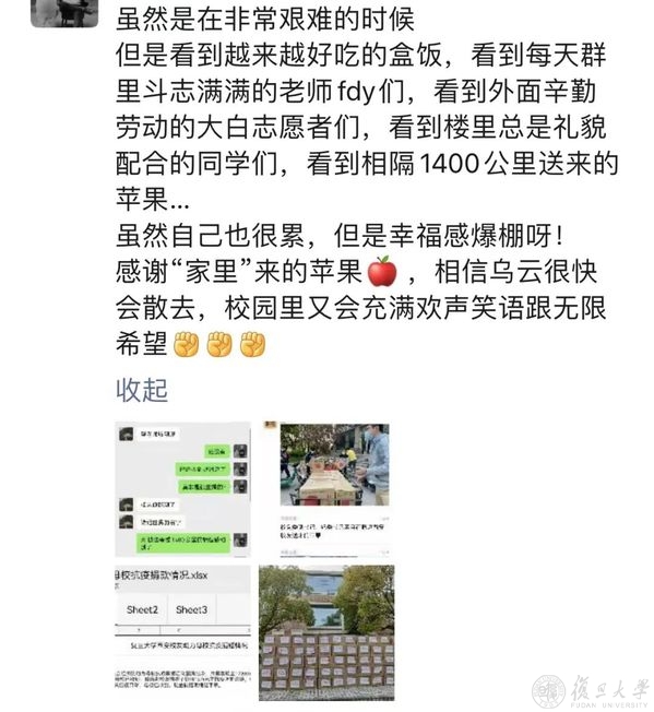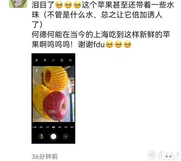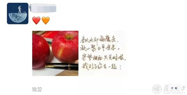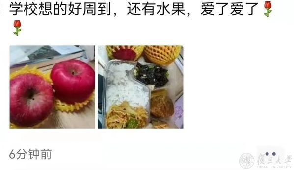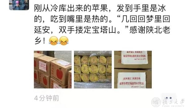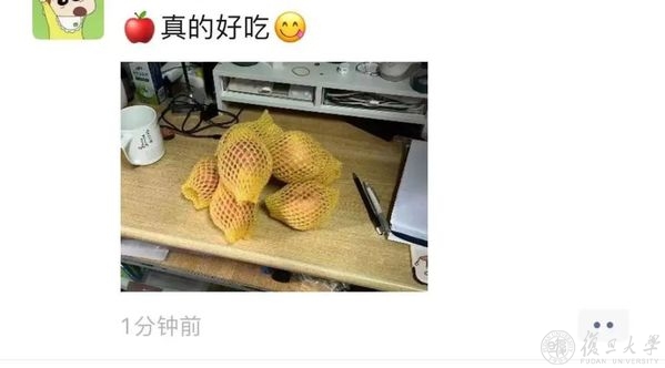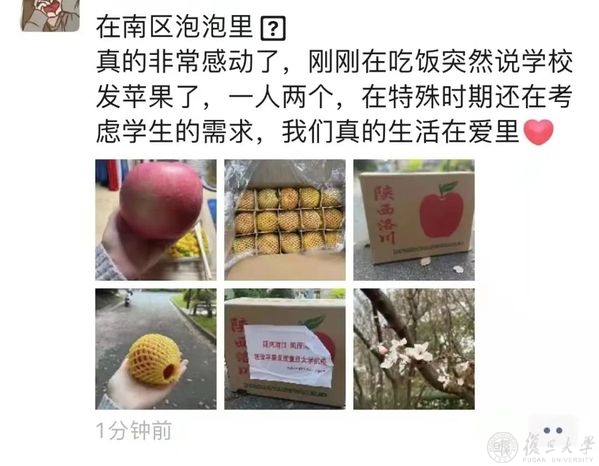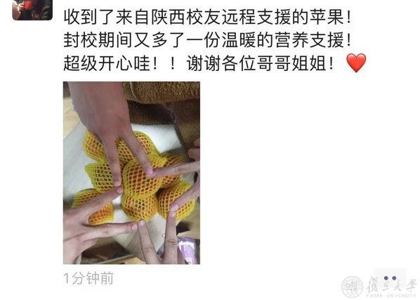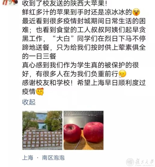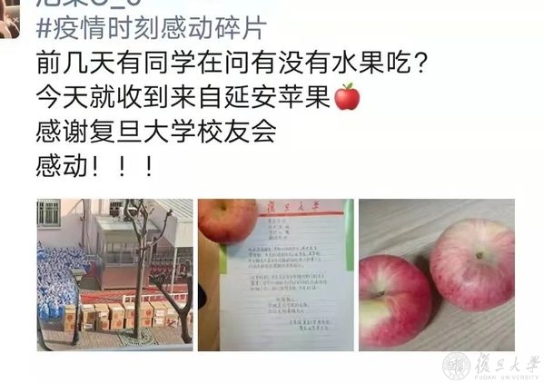 风雨同舟,守望相助,校友和社会各界的关爱和支持,复旦人都收到了,疫情当前,也倍知每一口食物的来之珍贵、来之不易,但没有一个冬天不可逾越,没有一个春天不会到来,就像一位同学收到苹果后,在朋友圈的有感而发,“希望,是我们这个时代像钻石一样珍贵的东西。”