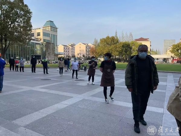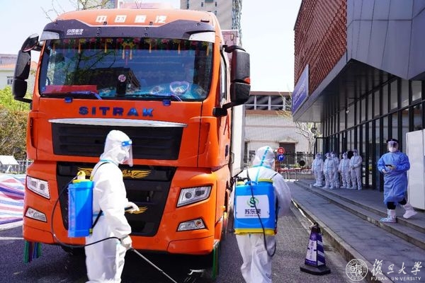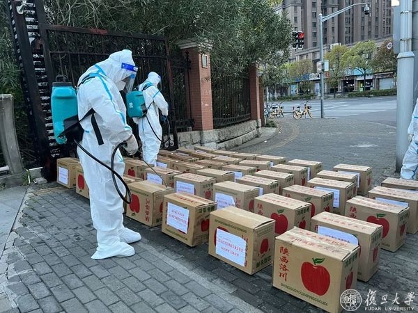 13点30分,本部和北区的457箱苹果正在消杀,手拿“延河江浦,风雨同舟,复旦感谢您!”的字牌,在校复旦人用自己的方式向校友致敬。