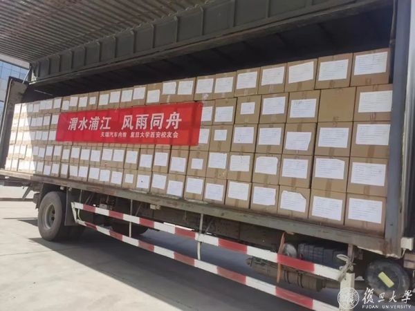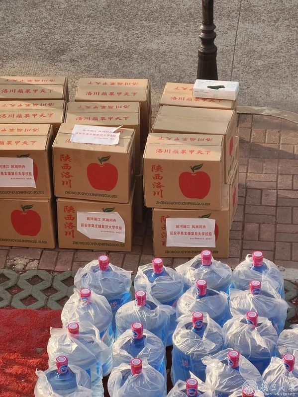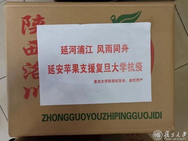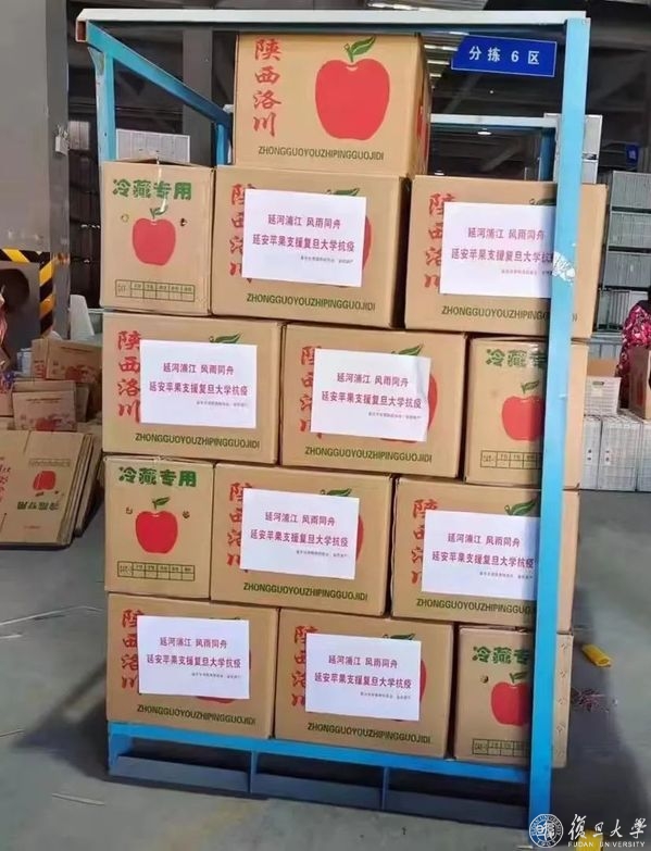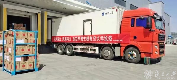 4月6日中午11点,写着“延河浦江,风雨同舟,延安苹果支援复旦大学抗疫”的货车载着195箱苹果,准时进入枫林校区。