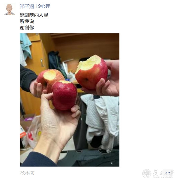 “做核酸回来领了两个苹果,觉得今天太美好了。”2019级中国语言文学系本科生蒋畅语,自学校采取严格封控管理措施后,她每次去食堂都会问阿姨“今天有没有水果?”,但每次都令她失望。没想到今天做完核酸检测回到宿舍,就收到了两个苹果,“苹果很红,不愧是延安来的,口感和新鲜度比自己在外面买的还好。感谢学校、校友对我们学生的挂念。”