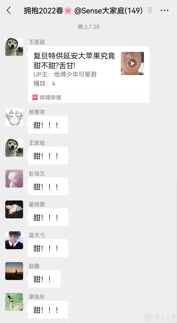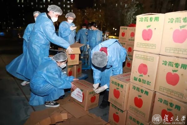 4月5日晚11点半,当载满苹果的货车正在疾驰而来时,一个名叫“苹果群”的校内对接群组建起来了。学校办、外联处、保卫处、总务处、团委、学工部、研工部、医学学工部、人事处、枫林管委会、张江管委会、江湾校区等各个部门同事在群里迅速行动,开展爱心接力。