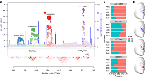 比如,rs8068343作为SOX9附近的独立位点,在欧亚之间具有显著的频率差异,造成鼻部更突出的基因型在欧洲占据主导,研究者推测该位点很可能引起欧亚之间的鼻部差异,而SOX9附近的其余三个位点更多的影响人群内部差异。