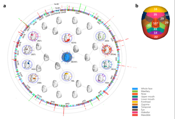 研究人员基于近10,000例3D人脸图像,首先构建了一套结合解剖学信息的面部分割方法。将面部区域聚合为10块主要结构,分别为额头、眉弓、眼睛、颞部、颧部、鼻部、面颊、嘴上、嘴下以及下颌。这样获取的分割后面部表型能完美对应到解剖学位置,为后续开展遗传学解析奠定了基础。