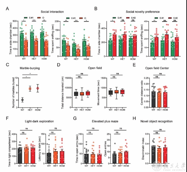 据报道SHANK基因家族的SHANK2和SHANK3基因与孤独症密切相关,但是SHANK1基因由于其基因敲除小鼠缺乏孤独症样表型而被长期忽视。研究人员对孤独症病例及对照人群进行测序筛查时,发现SHANK1基因编码区在两个独立病例中重复了相同的错义突变c.2621G> A (p.R874H),生物信息学分析和体外细胞实验均显示该突变具有强致病性。为了在体内水平确认并系统研究该突变对孤独症的致病性,研究人员构建了同源突变敲入小鼠模型(Shank1 R882H-KI),且鉴定到社交障碍和刻板重复行为这两个孤独症样核心症状表型。该项研究全面整合模型小鼠行为学评估、神经影像学定位受累脑区、神经元形态及突触结构到相关信号及功能蛋白的分子变化,从不同层次全面阐明孤独症核心症状的重要分子机制。