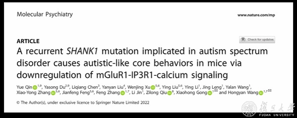 2022年4月6日,复旦大学附属妇产科医院王红艳教授团队/生命科学学院公晓红副教授在Nature旗下精神疾病领域国际学术期刊Molecular Psychiatry以Article形式在线发表了题为“A recurrent SHANK1 mutation implicated in autism spectrum disorder causes autistic-like core behaviors in mice via downregulation of mGluR1-IP3R1-calcium signaling”的文章。该研究通过遗传改造的小鼠模型解析病源性突变的致病效应,揭示了孤独症核心症状的分子机制。