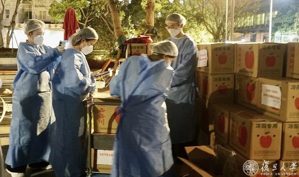 在食堂测温点,164人次的青年志愿者参与保证购餐者体温正常;四个校区115名青年志愿者参与接收搬运农副产品、防护用品等捐赠物资,将社会关心与支持送达每一个复旦人手中。