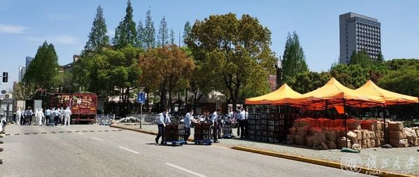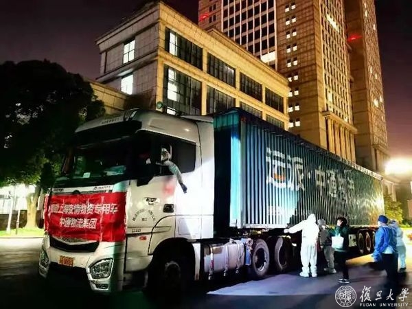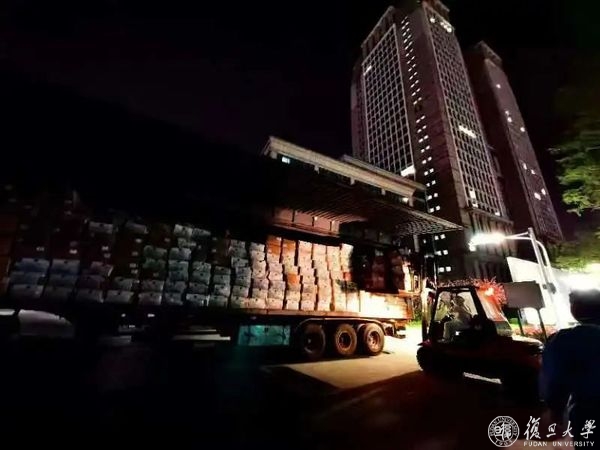 就在德宏物资抵达复旦的前一天(4月8日)晚上,22点30分,另一辆重型货车,停在了光华楼前,这辆足有90立方的货车,让车身悬挂的长约7米的条幅,都显得如此短小。