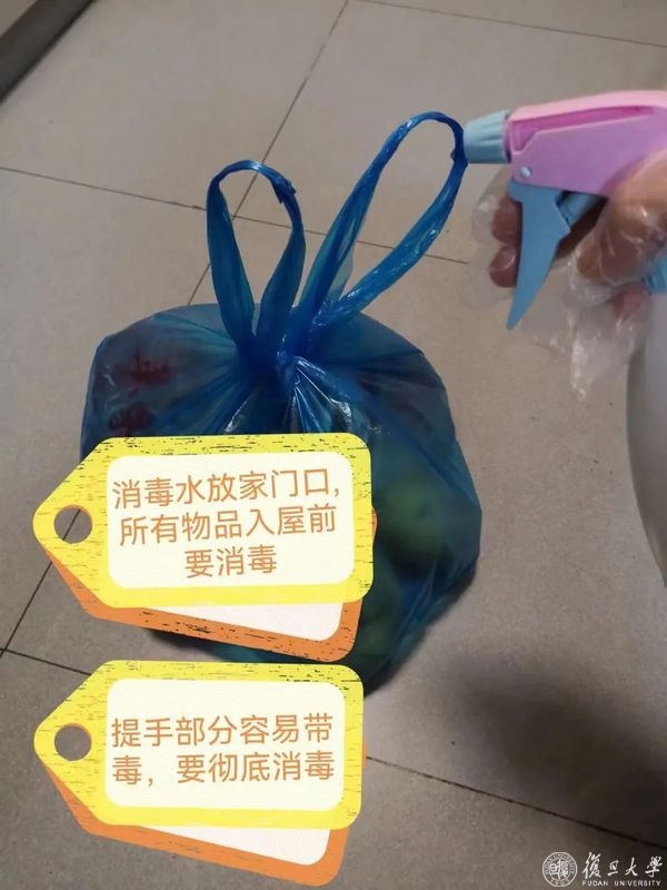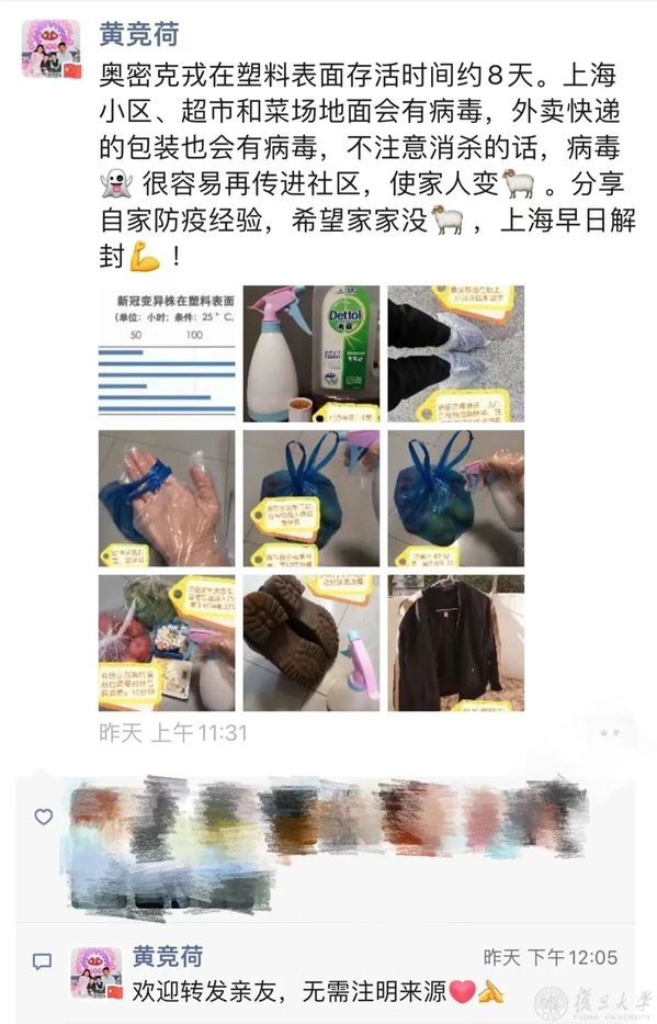 她查阅了相关文献资料,关注从奥密克戎病毒在塑料表面的存活时长、到对杀灭新冠病毒有效的物质成分、再到最容易被人忽略的病毒传播渠道;为了便于理解,她上阵自拍,演绎防护、取菜、消毒的全过程,并配上简洁易懂的文字,发到楼栋微信群里提醒大家——小区、超市和菜场地面易存留病毒,外卖快递包装也是病毒的“藏身之所”,不注意消杀的话,病毒很容易再传进社区、传给家人,需要提高警惕。