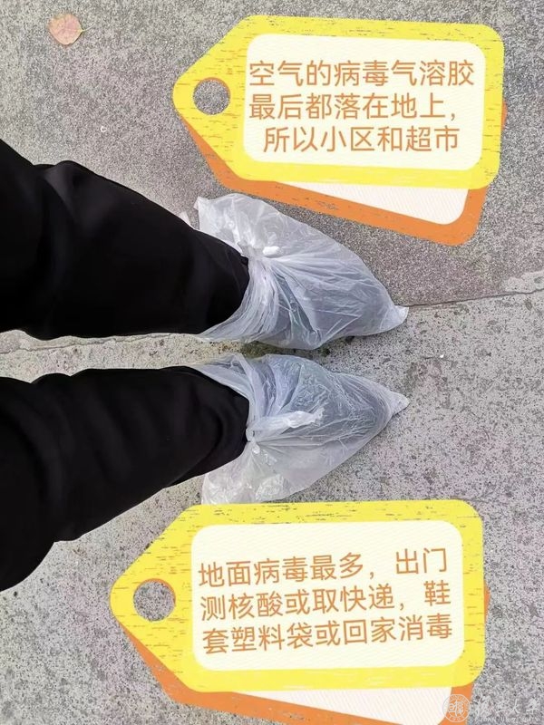 黄竞荷发现很多居民在团购、领取物资、核酸采样时,忽略了防护细节,增加了感染病毒的风险。“之前有研究表明,病房里面病毒最多的地方是护士的鞋底,从地面踩到的病毒,又会带去其他的地面。所以拿菜、做核酸回来后,如果没有对鞋底进行消毒,可能就会把病毒带回家,是否能够做好细节防护是关乎防止疫情扩散的问题。”黄竞荷从微信群感受到小区邻居们对不断发现阳性感染者的恐慌和对此事的关注,于是决定为大家做一次科普。