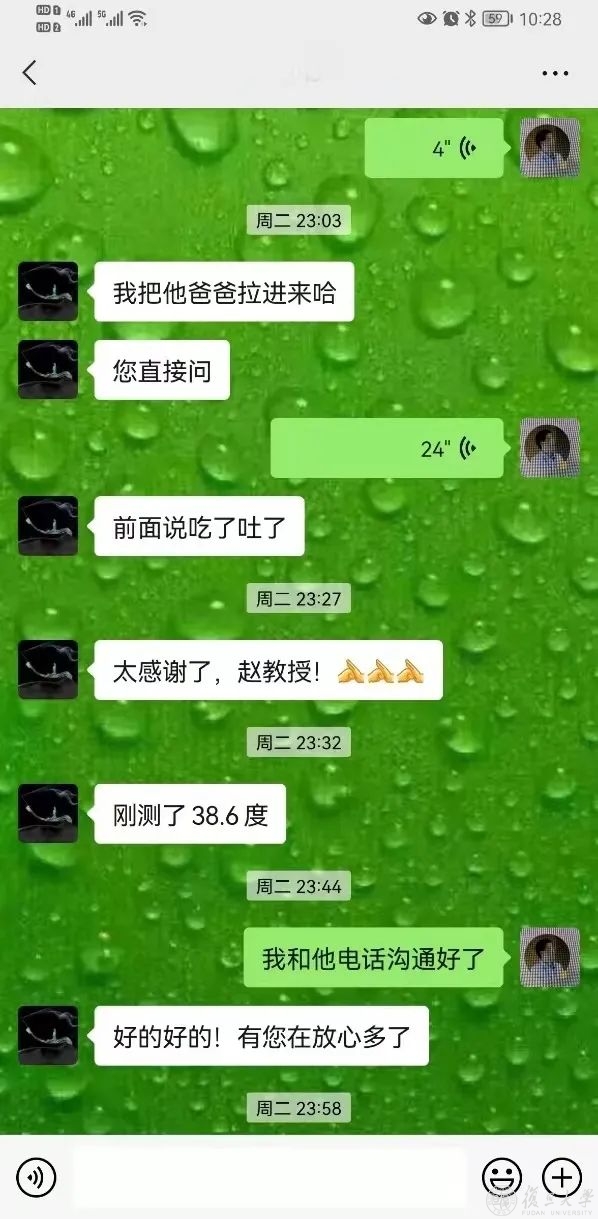作为闻玉梅的学生,赵超曾是导师作为抗击非典优秀共产党员事迹宣讲报告团中的一员,“当时我就受到深深的教育,导师的故事也根植在我的血液中。”他也接过导师的接力棒,在小区一位17个月大婴儿出现高热,婴儿父母均确诊阳性暂未转运的情况下,赵超紧急为他们提供医学咨询和对接,稳定了婴儿父母的情绪,并持续跟踪为他们提供突发症状的应对策略和就医流程。就是这样的援助,把温暖送到居民心中,小区居民也备受鼓舞,友爱互助,在志愿者防疫物资短缺的情况下,居民尽己所能,为志愿者购买防疫物资进行募捐。“大家也受到教育,真正相信我们,认可我们。”