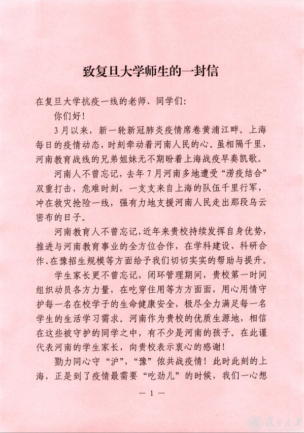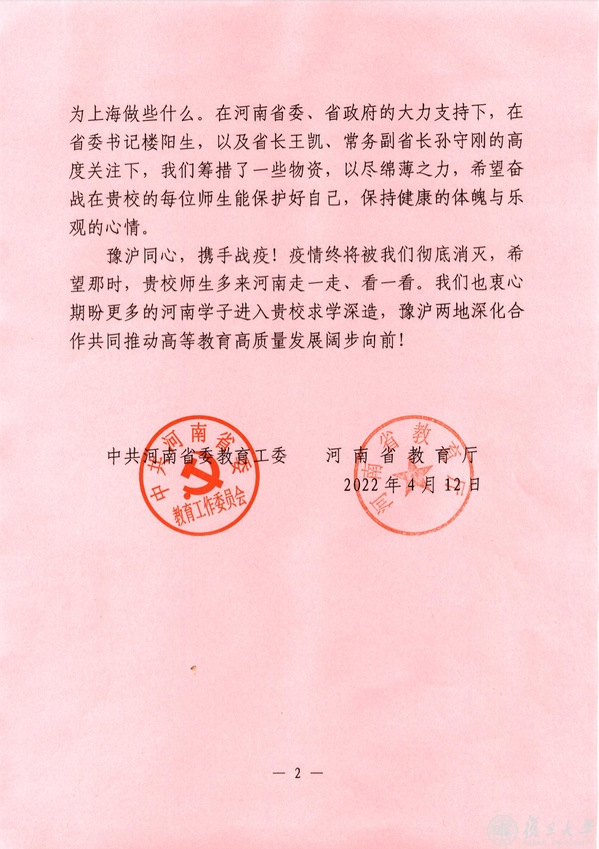 河南省教育工委、河南省教育厅在《致复旦大学师生的一封信》中表示,“上海每日的疫情动态,时刻牵动着河南人民的心,虽相隔千里,河南教育战线的兄弟姐妹无不期盼着上海战役早奏凯歌。”